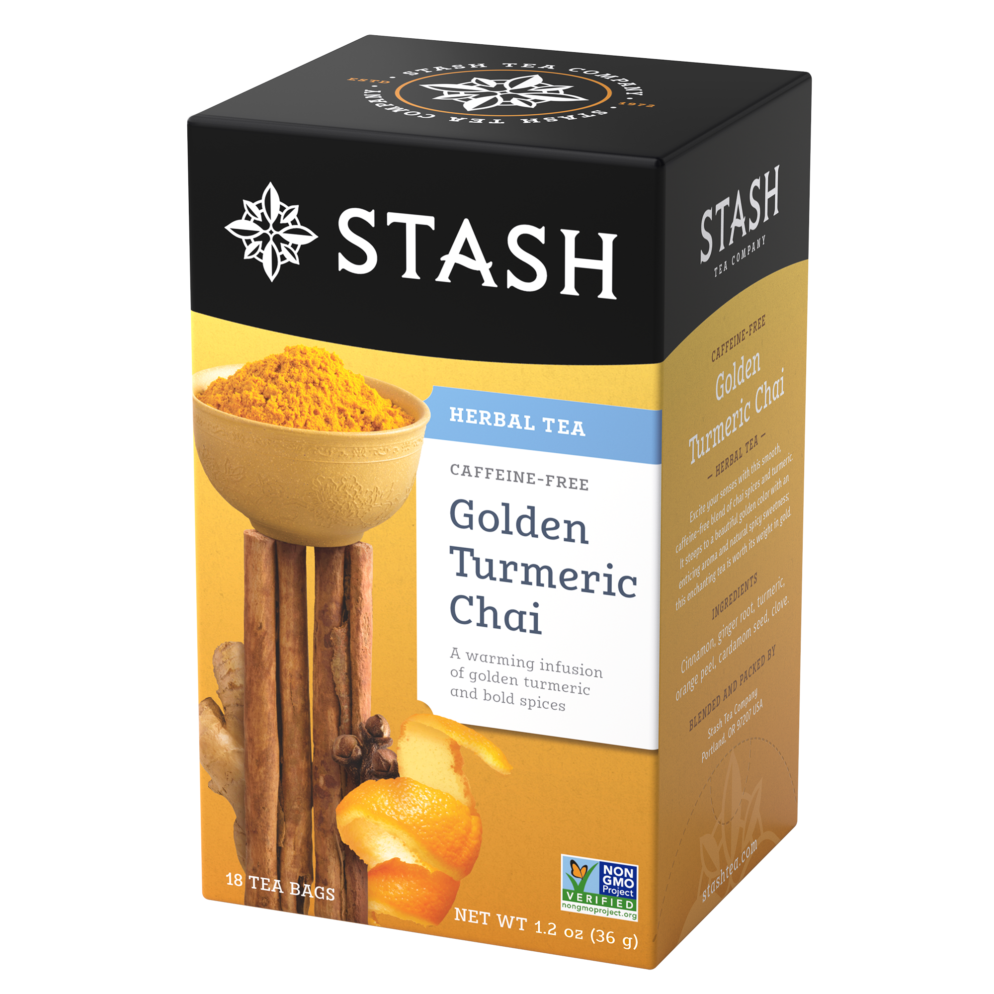 Our Golden Turmeric Chai combines Chai Spices with Turmeric to make a caffeine free version that's pure Gold.