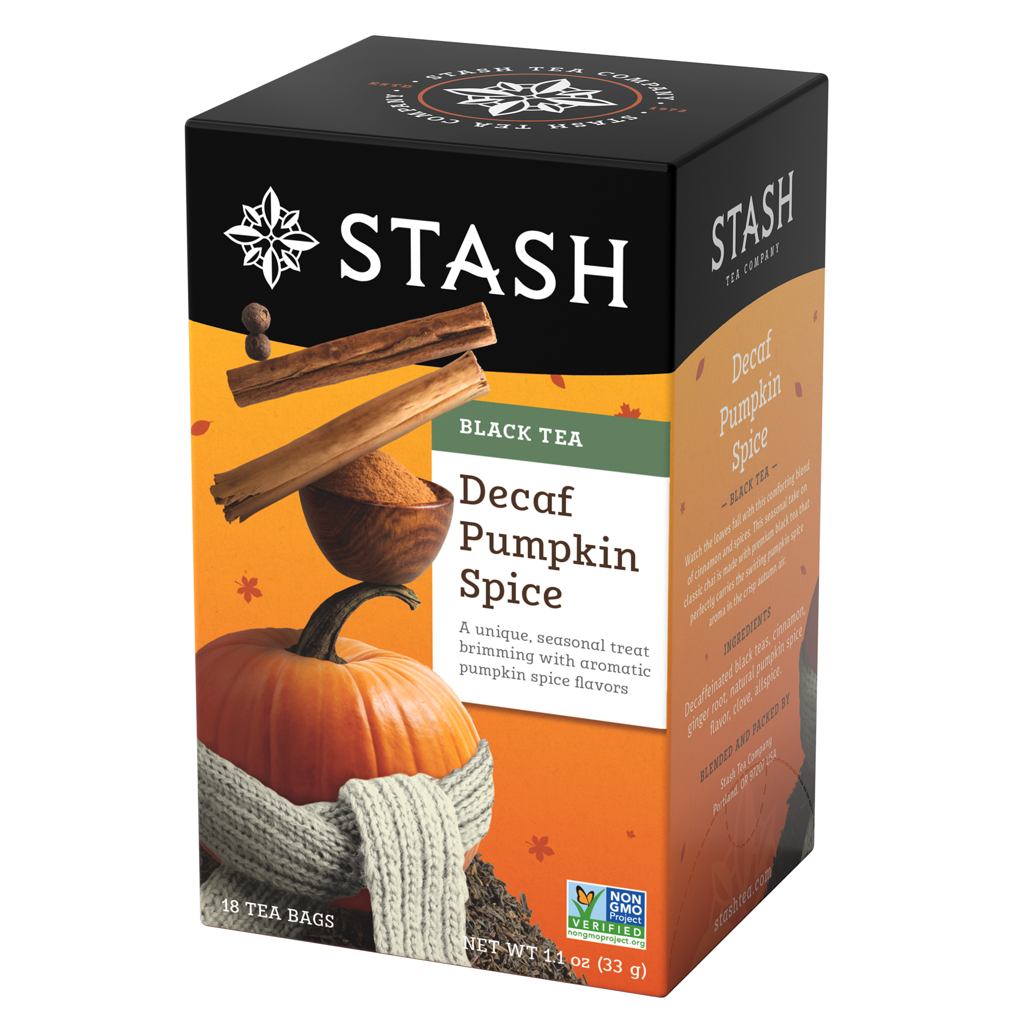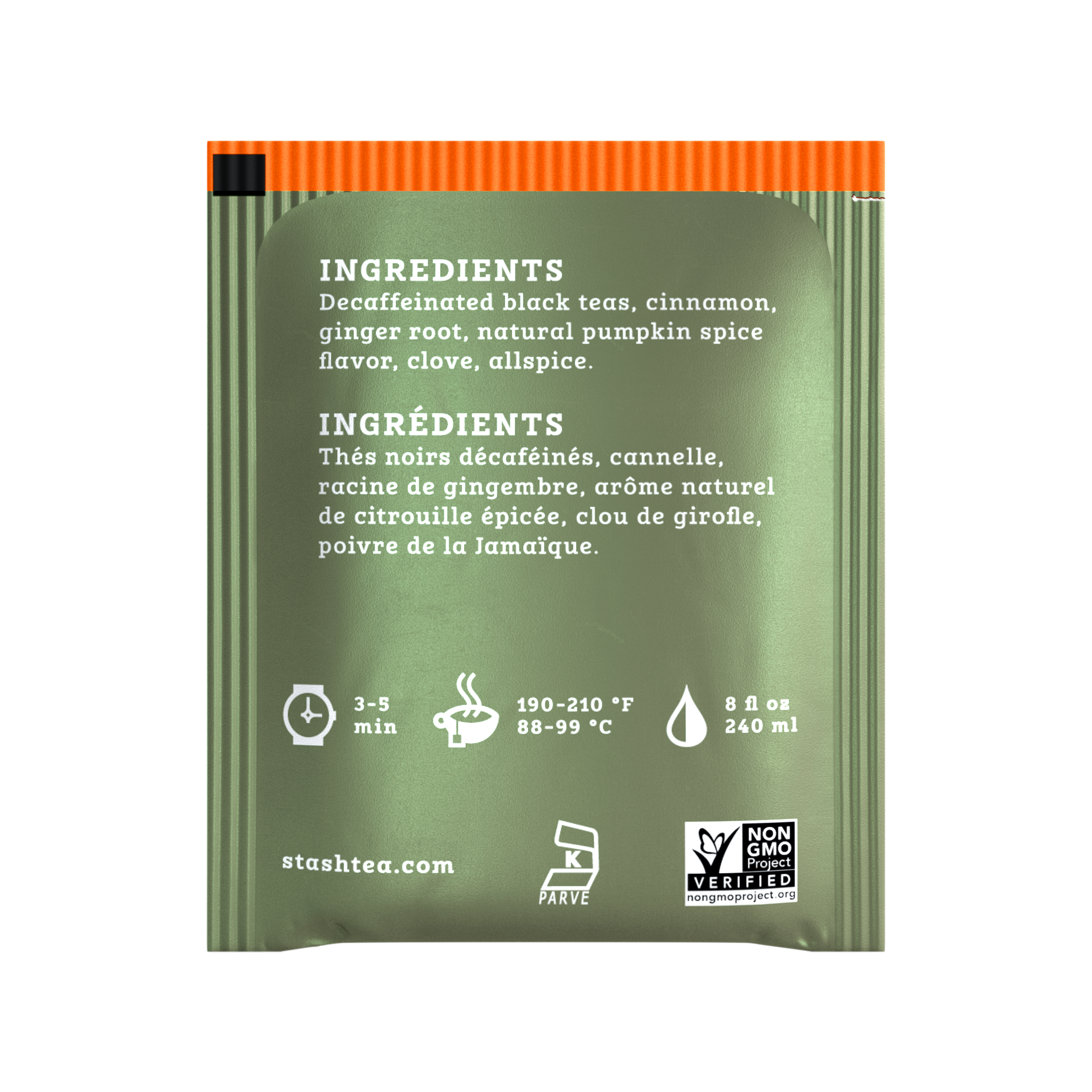 Pumpkin spice! This festive holiday tea evokes a tasty pumpkin pie. A delicious blend of naturally decaffeinated black teas & natural pumpkin spice flavor combines with cinnamon, ginger & clove. Add a touch of milk and sugar to complement the flavor.