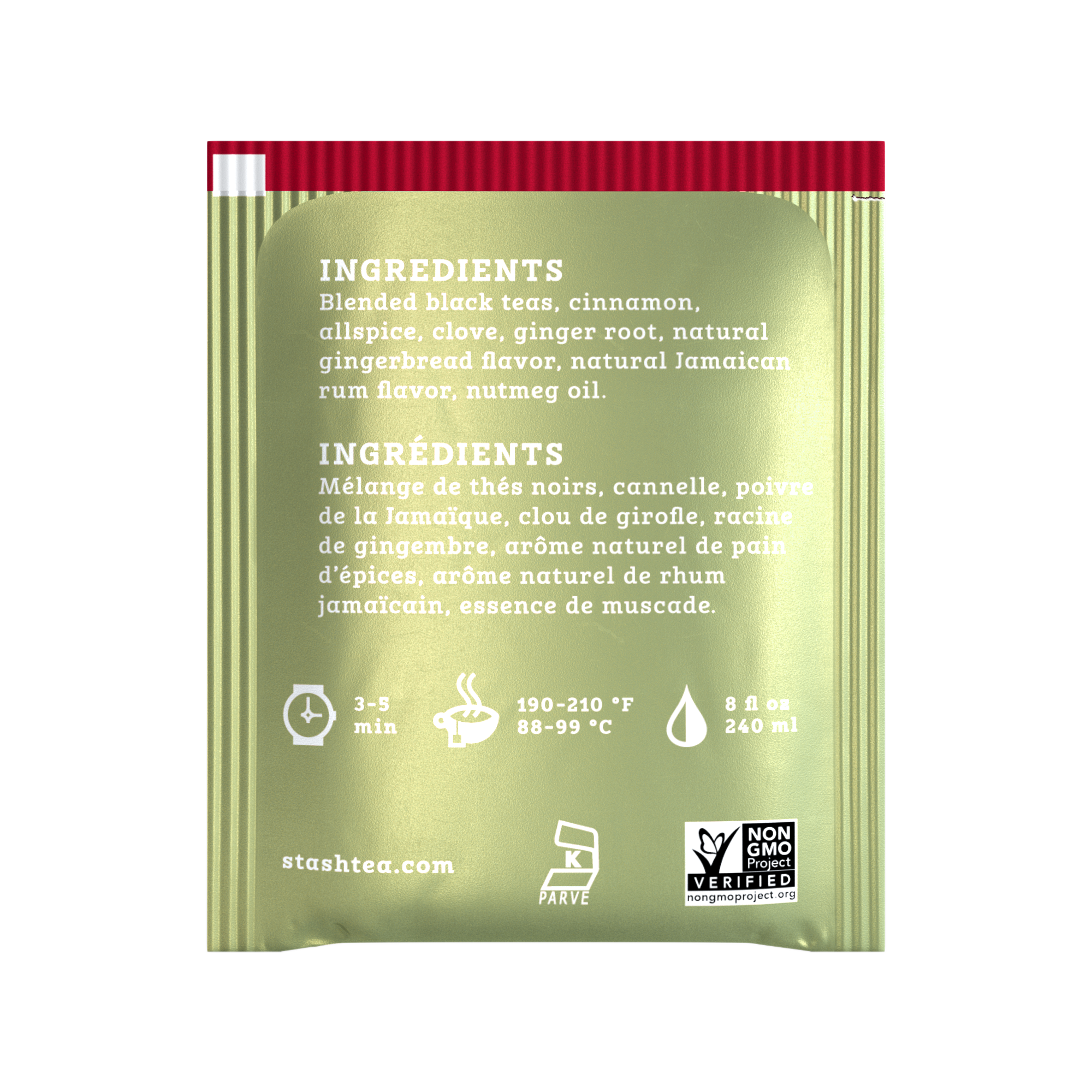 Festive spices! Natural flavors of gingerbread and rum give this chai a unique twist. The brewed tea has a spicy-sweet gingerbread aroma, with a flavor that is medium-bodied. This tea is excellent plain or with milk (regular or evaporated) and sugar.
